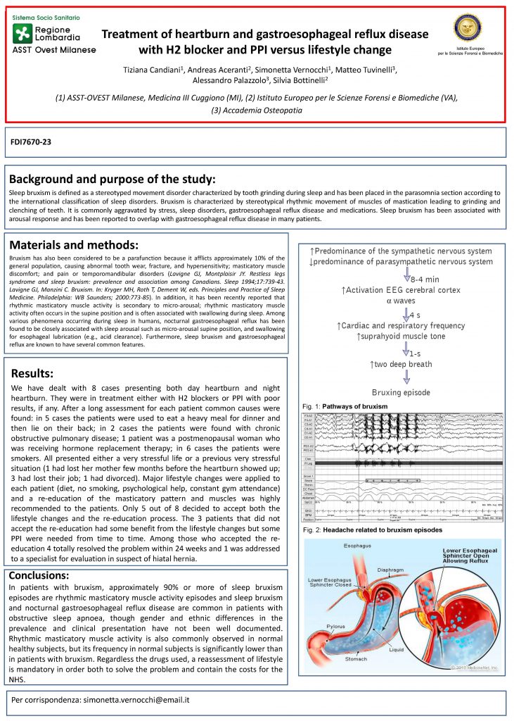 Sleep bruxism has been associated with arousal response and has been reported to overlap with gastroesophageal reflux disease (GRD) in many patients. Among various phenomena occurring during sleep in humans, nocturnal gastroesophageal reflux has been found to be closely associated with sleep arousal such as micro-arousal supine position, and swallowing for esophageal lubrication (e.g., acid clearance). Sleep bruxism and gastroesophageal reflux are known for several common features. We dealt with 8 cases presenting both day heartburn and night heartburn. They were in treatment either with H2 blockers or PPI with poor results, if any. Common causes were found: in 5 cases the patients used to eat a heavy meal for dinner and then lie on their back;  2 patients were found with chronic obstructive pulmonary disease; 1 patient was a postmenopausal woman on hormone replacement therapy; 6 patients were smokers. All presented a very stressful life or previous very stressful situations. Major lifestyle changes and a re-education of the masticatory pattern and muscles was highly recommended to the patients. Only 5 out of 8 decided to accept both the lifestyle changes and the re-education process. 3 patients did not accept the rieducation and had some benefit from the lifestyle changes but some PPI were needed from time to time. Among those who accepted the re-education 4 totally resolved the problem within 24 weeks and 1 was addressed to a specialist for evaluation in suspect of hiatal hernia. Sleep bruxism and nocturnal GRD are common in patients with obstructive sleep apnoea.
