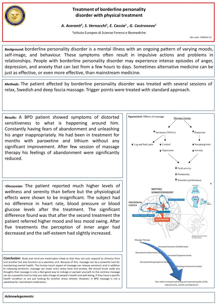 Results: A BPD patient showed symptoms of distorted sensitiveness to what is happening around him. Constantly having fears of abandonment and unleashing his anger inappropriately. He had been in treatment for months with paroxetine and lithium without any significant improvement. After few session of massage therapy his feelings of abandonment were significantly reduced.